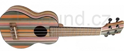 FZone FZU-103C Rainbow - koncertní ukulele z prémiové řady Rainbow Recombinant Wood vyznačující se krásnou barevnou kombinací přední desky, lubů, zádi a také hlavy nástroje vzniklé pomocí kombinace různých typů dřev. Hmatník a kobylka nástroje jsou vyrobeny z ořechového dřeva. Ladící mechanika je černá a nástroj je osazen vysoce kvalitními strunami Aquila. Díky exotické kombinaci dřev poskytuje nástroj nejen překrásný vzhled, ale také výrazný a příjmený zvuk.
